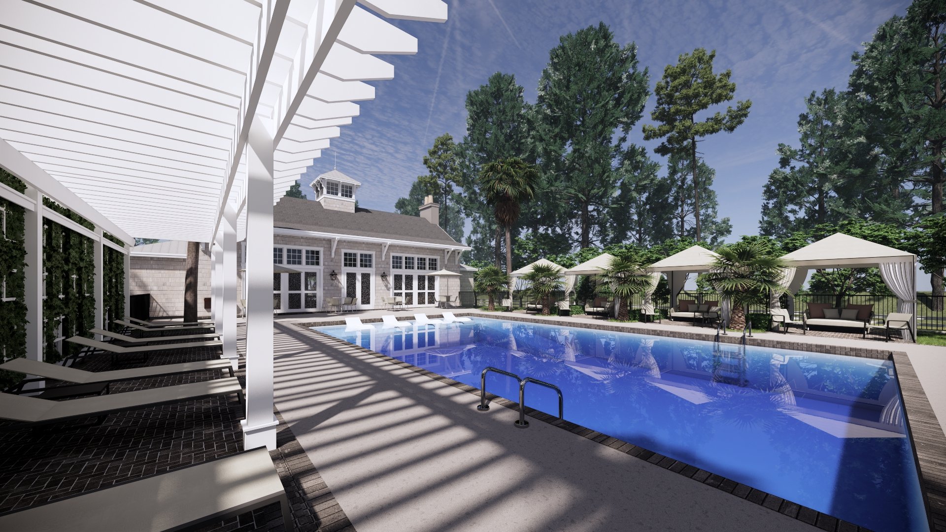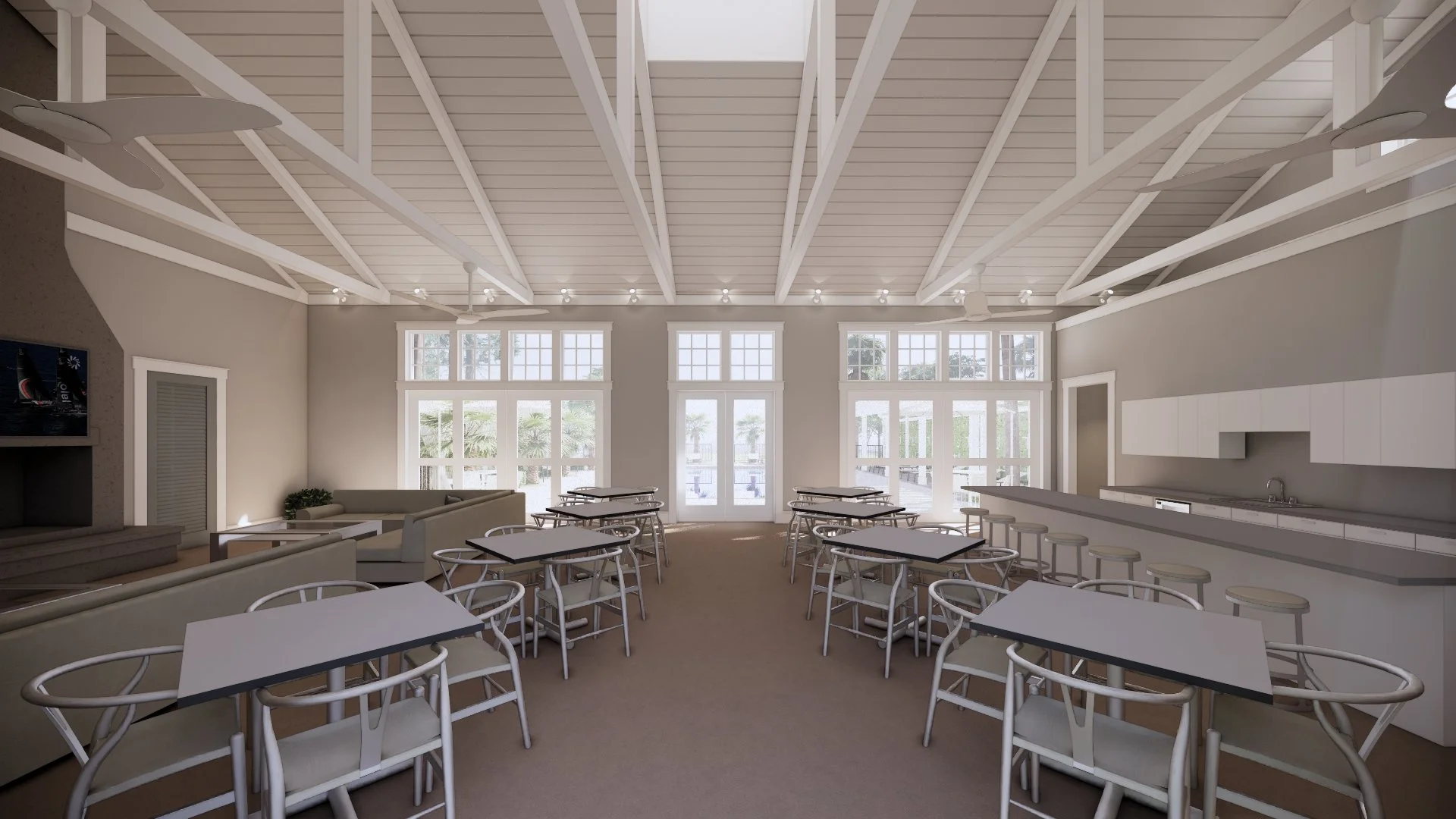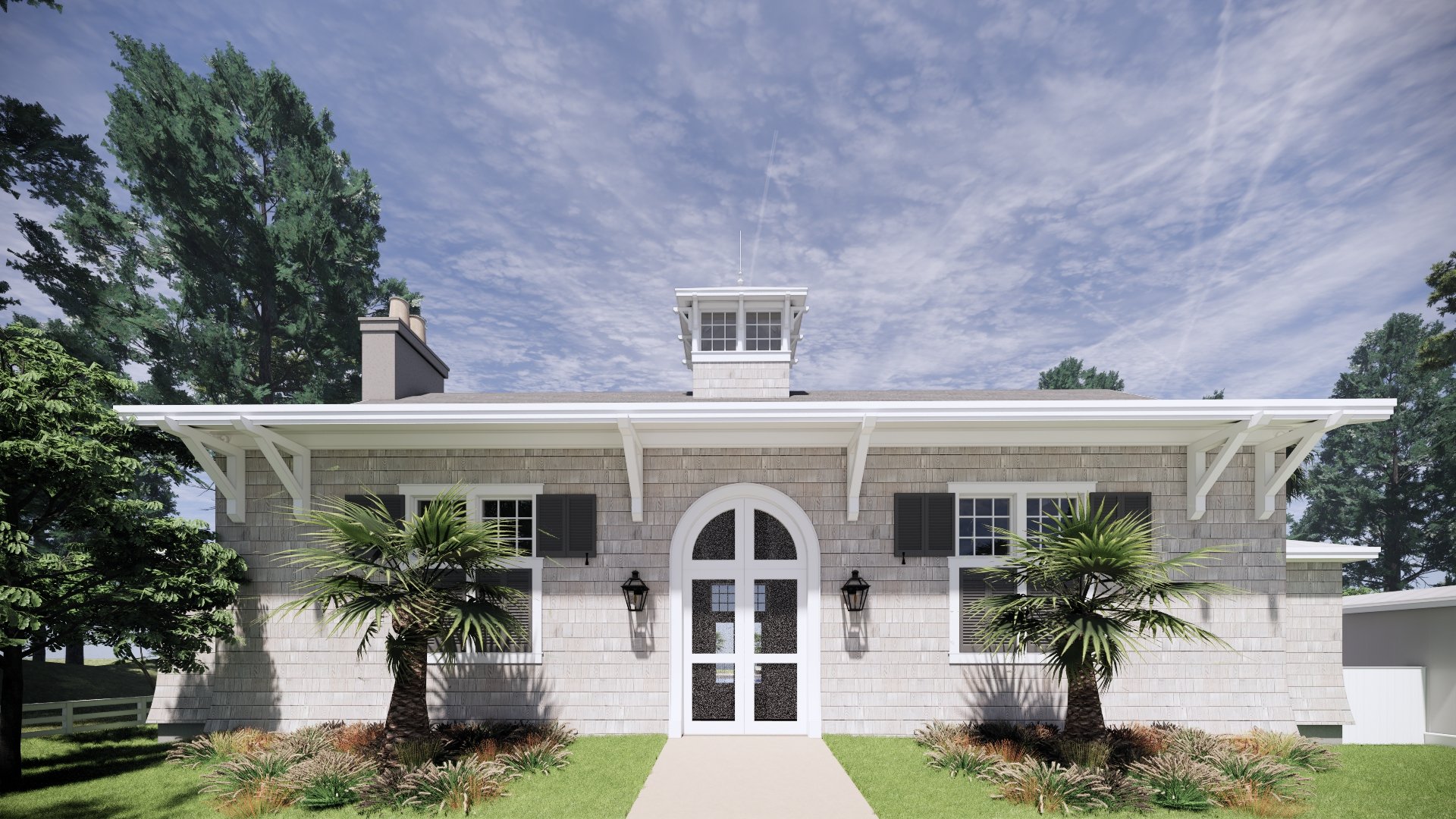 Covered outdoor patio with brick floor, ceiling fan, and view of a green backyard with trees, shrubs, and a lake.